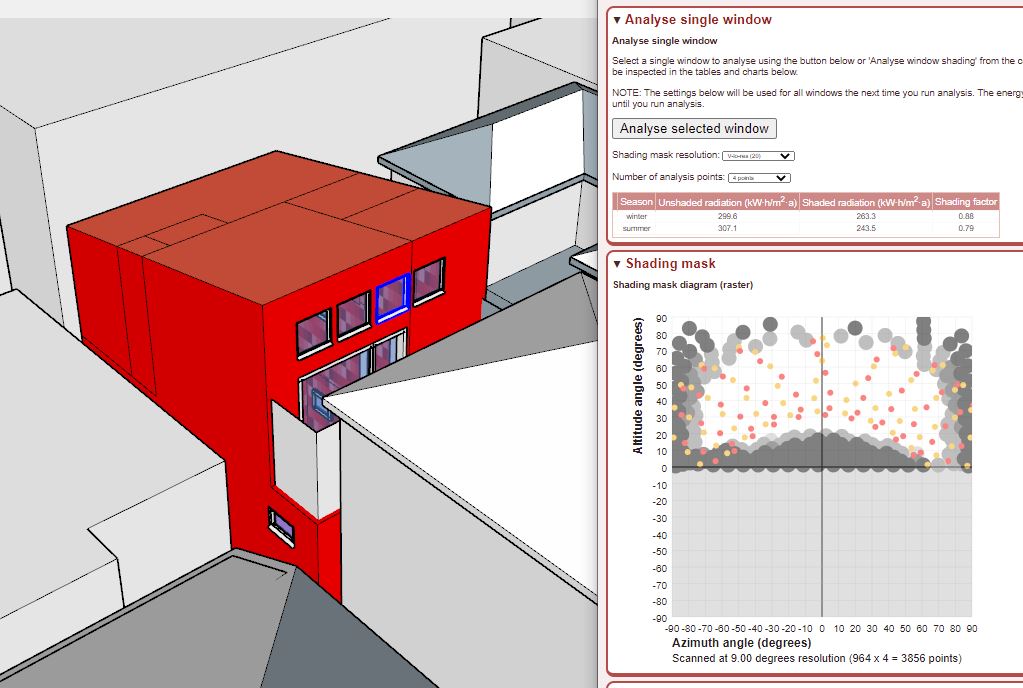 designPHによる南面開口部の日射取得解析。遮蔽マスクダイアグラムとシミュレーション結果の数値表示。