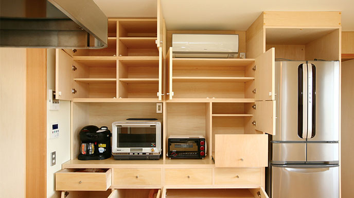 建具の枠や、造作家具は全て大工さんに製作してもらいました。素材感が統一されて落着いた雰囲気に仕上がります。
