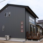 外壁はガルバリウム鋼板仕上げとし、雨どいにはタニタハウジングウェア製のガルバリウムを採用。