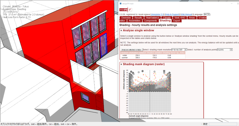 本プロジェクトでは、南面の開口部が日射取得の鍵を握っていました。そこで、designPHを用いてこの窓に対する日射遮蔽の解析(Shading analysis)を行い、シミュレーション結果を確認しました。以下は上記のグラフで検討したdesignPHの画面です。