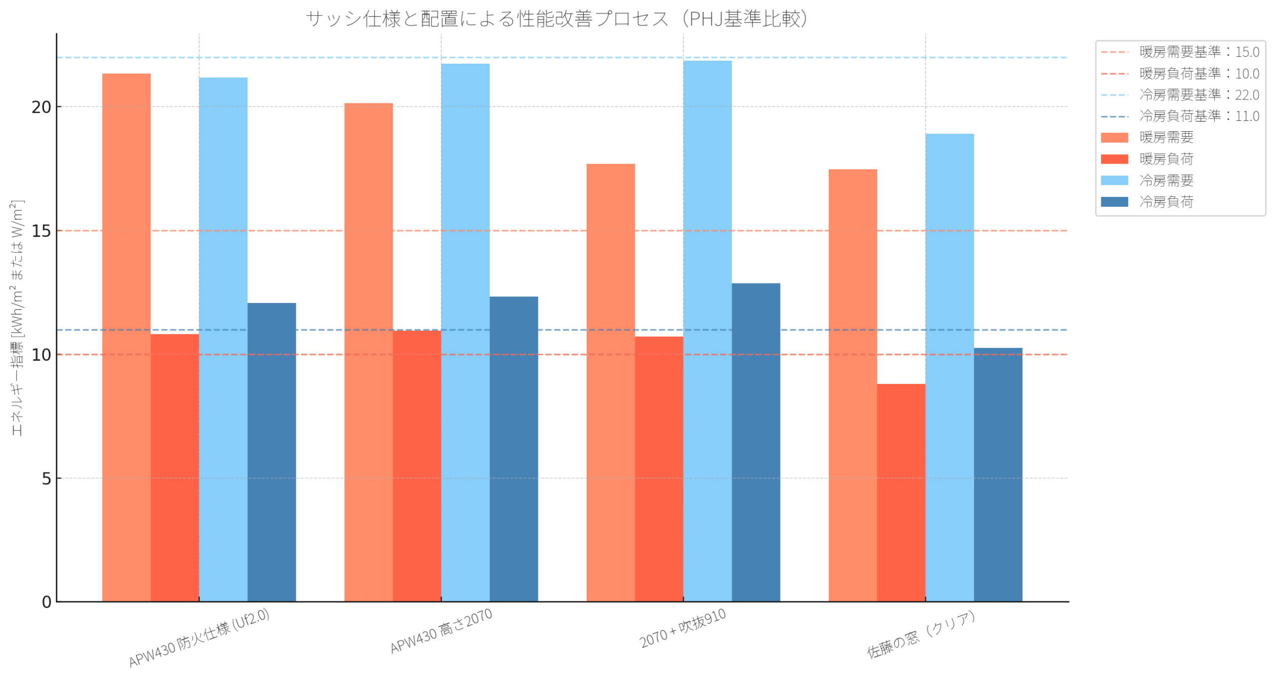 このグラフは、単なる高性能窓の選定だけでなく、配置と取り付け方の影響も大きいことを裏付けています。
